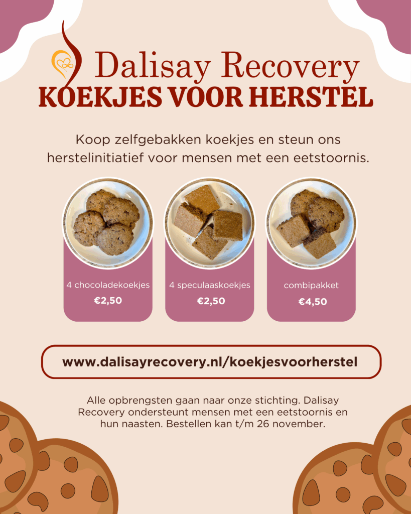 Om onze stichting financieel te steunen, bakken en verkopen we koekjes. De opbrengst gaat volledig naar stichtingΒ Dalisay Recovery, waarmee we mensen met een eetstoornis en hun naasten ondersteunen op hun weg naar herstel.